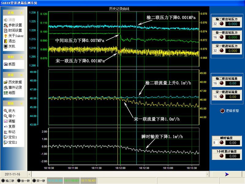 榆宋線2011年11月16日泄漏報警曲線圖