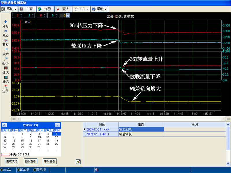 2009年12月25日1時(shí)13分41秒,361轉(zhuǎn)油站-敖包塔聯(lián)合站輸油管線發(fā)生泄漏。1時(shí)14分44秒系統(tǒng)發(fā)出報(bào)警提示,系統(tǒng)定位在距361轉(zhuǎn)5.56㎞處。