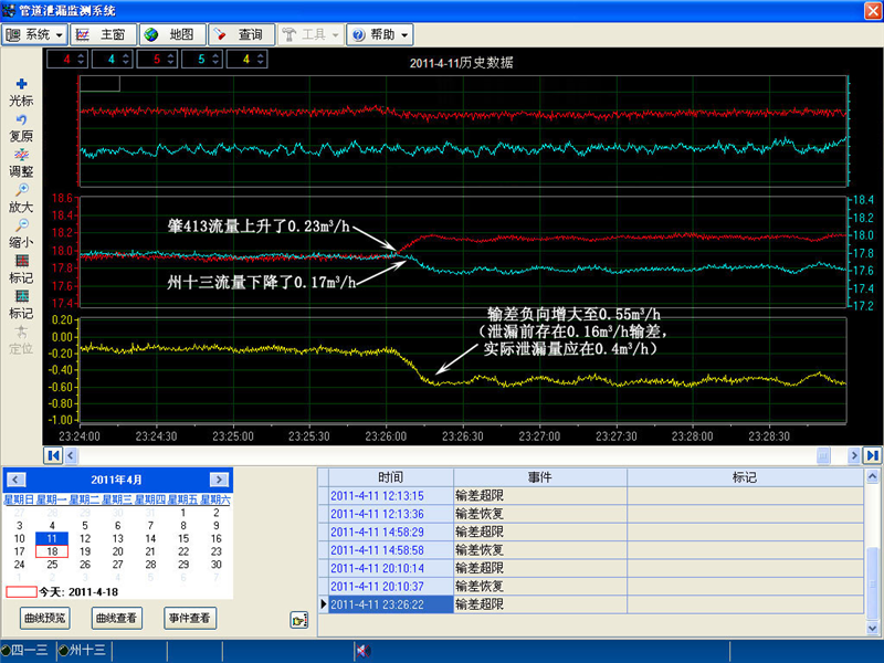 2011年4月11日肇413站-州十三管線泄漏報警曲線圖