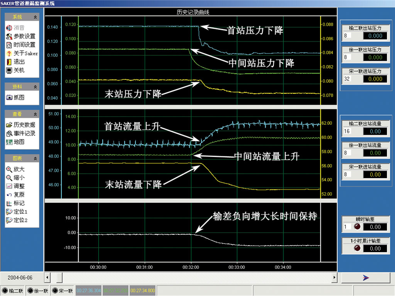 04年6月6日榆二聯(lián)-宋一聯(lián)管線泄漏報警曲線圖
