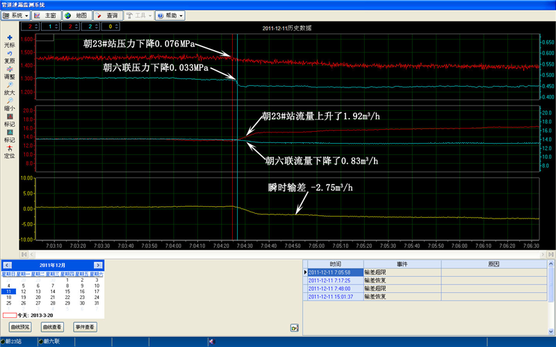 2011年12月11日7時(shí)04分該管線發(fā)生泄漏,60秒之后系統(tǒng)發(fā)出報(bào)警提示,泄漏一直持續(xù)到7時(shí)48分結(jié)束,歷時(shí)44分鐘,系統(tǒng)定位泄漏點(diǎn)距朝23轉(zhuǎn)1.67公里。