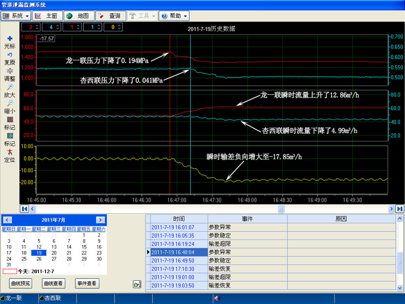 2011年7月19日管線(xiàn)發(fā)生泄漏:16時(shí)46分52秒泄漏開(kāi)始,48分04秒系統(tǒng)報(bào)警,至51分57秒關(guān)閥泄漏結(jié)束,歷時(shí)5分05秒,泄漏總量約為1.52m3。