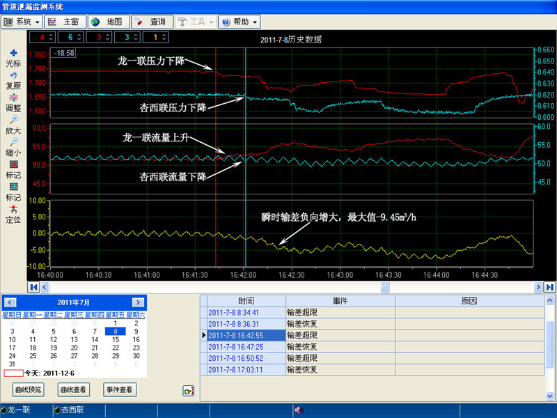 2011年7月8日管線發(fā)生泄漏:7月8日16時(shí)41分42秒開始**次開閥放油,42分55秒系統(tǒng)發(fā)出報(bào)警提示,至45分37秒泄漏結(jié)束,歷時(shí)3分55秒,期間有4次動(dòng)閥門調(diào)整泄漏量,泄漏總量約為0.26m3。第二次開閥放油為16時(shí)49分23秒開始,50分52秒系統(tǒng)發(fā)出報(bào)警提示,至17時(shí)01分13秒關(guān)閥結(jié)束,歷時(shí)11分50秒,期間有3次動(dòng)閥門調(diào)整泄漏量,泄漏總量約為1.39m3。