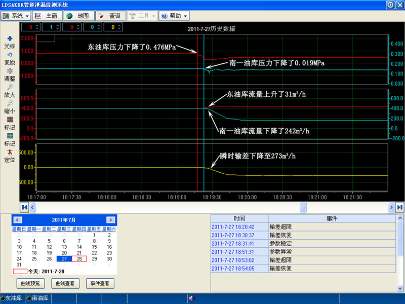 2011年7月27日東油庫(kù)—南一庫(kù)輸油管線發(fā)生泄漏,泄漏發(fā)生時(shí)間為18時(shí)19分17秒,系統(tǒng)在18時(shí)20分42秒發(fā)出報(bào)警,定位泄漏位置在距東油庫(kù)5.85公里處,值班人員及時(shí)確認(rèn)并同時(shí)上報(bào),在18時(shí)28分57秒停泵,整個(gè)過(guò)程共用時(shí)9分40秒。后查實(shí)該次泄漏為南一路改造施工挖掘機(jī)意外挖破管線造成。