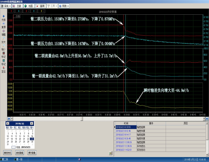 2019年3月23日葡二聯(lián) - 葡一聯(lián)輸油管線發(fā)生泄漏,系統(tǒng)紀(jì)錄顯示:8時38分55秒泄漏開始,泄漏監(jiān)測系統(tǒng)于8時39分55秒發(fā)出報(bào)警,報(bào)警原因?yàn)椤拜敳畛蕖?系統(tǒng)定位在距葡二聯(lián)5.60公里處。